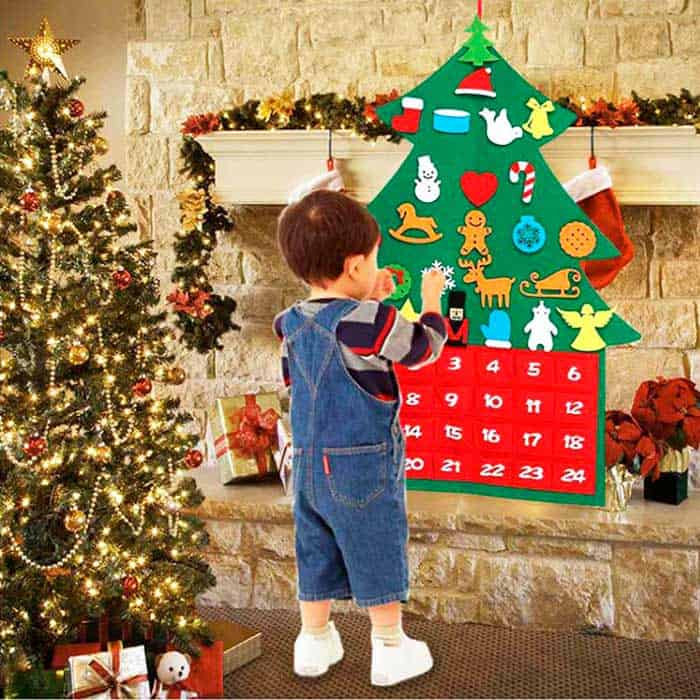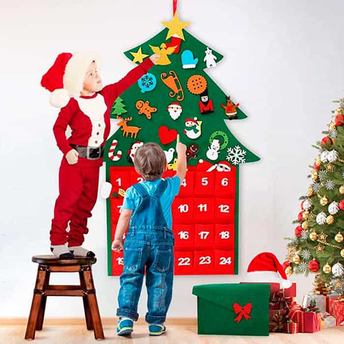 Vianočný stromček je vyrobený z mäkkej vlny a má 24 vrecká, ktoré predstavujú kalendár do Vianoc! Vrecká skrývajú sviatočné ozdoby, ktoré dieťa umiestňuje na stromček pomocou suchého zipsu!