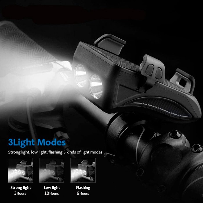 1x svetlo na bicykel s nabíjacou stanicou, držiakom a zvončekom, 1x USB kábel
