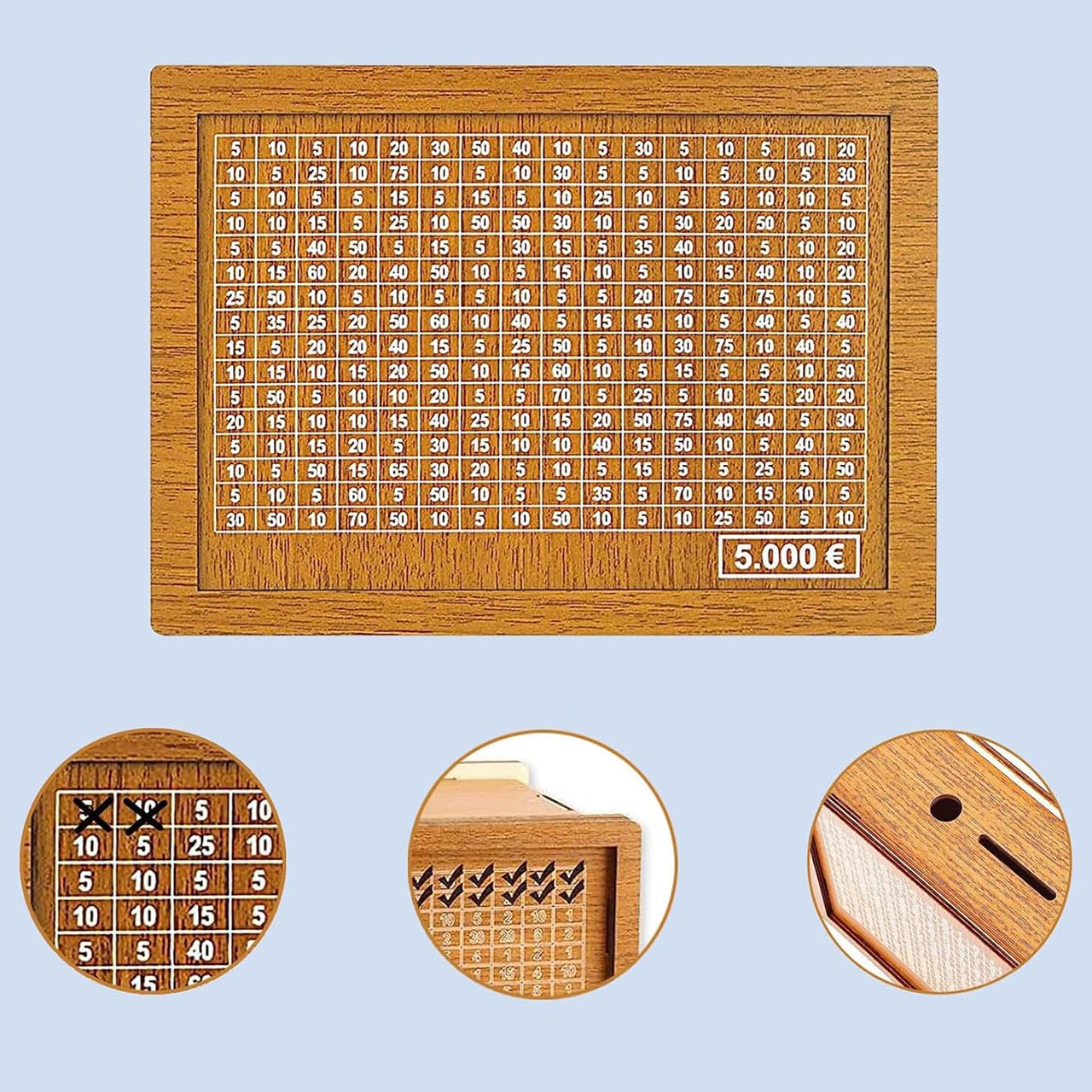 Naša úložná schránka má na povrchu špeciálnu mriežku, ktorá vám pomôže sledovať vaše úspory. Každýkrát, keď vložíte peniaze, môžete označiť sumu na mriežke, aby ste si ľahko sledovali svoj pokrok. Keď sú všetky políčka zaškrtnuté, otvoríte schránku a užijete si svoje úspory. Na prednej strane schránky je tiež priestor, kde si môžete zapísať svoj cieľ úspor, čo vás povzbudzuje, aby ste sa sústredili na svoj účel. Schránka je jednoduchá na použitie a má široké otvorenie, takže môžete ľahko vkladať mince a bankovky. Šetrenie s touto schránkou sa stáva zábavným a motivujúcim!