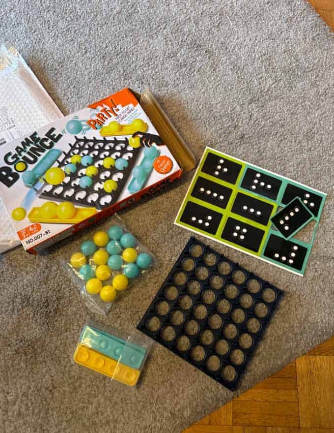 1x herná doska HopGame, 4x držiak na figúrky, 16x guľka, 9x karta s vzorom