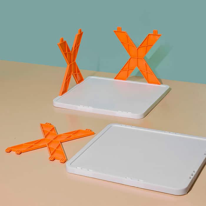 Zložte stojan na topánky vložením oranžových bočných častí do otvorov v bielej časti. Pokračujte tým, že ich budete skladať a prichytíte jeden na druhý. Môžete ich použiť na ukla