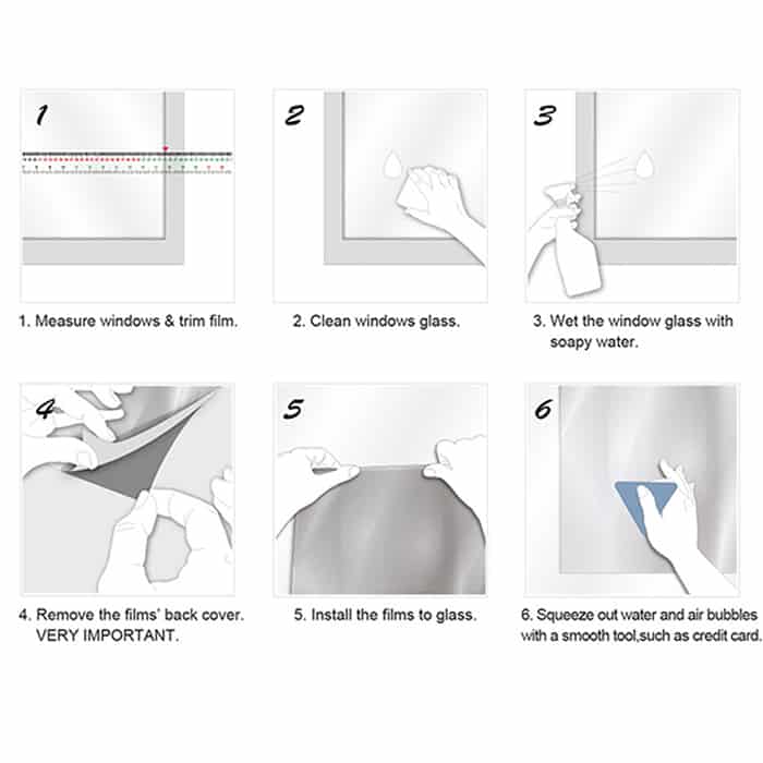 Odmerajte povrch a odstrihnite nálepku. Vyčistite sklo. Navlhčite sklo mydlovou vodou. Fóliu položte na sklo a vyhlaďte ju plochým predmetom, aby ste odstránili všetky bubliny a vodu.