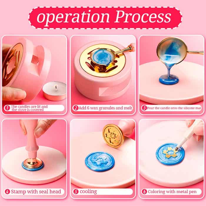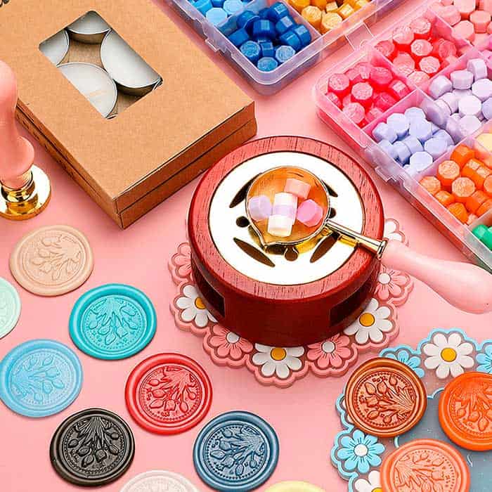| V Balení: | 10x pečatné motívy, 1x pinzeta, 1x lyžička na roztavený vosk, 1x ohrievač na roztavenie vosku, 1x rukoväť na pečatenie, 1x silikónová podložka, 1x ceruzka, 1x nádoba s voskom s 10 rôznymi farbami (biela, fialová, modrá, zelená, žltá, 3 rôzne ružové farby, oranžová, červená) |